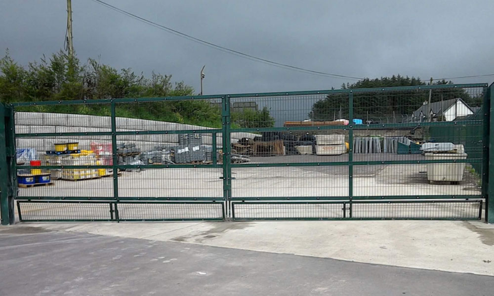 On site here, there was a fall off in the the ground towards the gate closing position. It was decided to fabricate the gates with flexible section to allow for opening. The gates are locked in position when closed. The gates are hot dipped galvanised and coated green. They are clad with 3m mesh which has been used to fence off the yard.